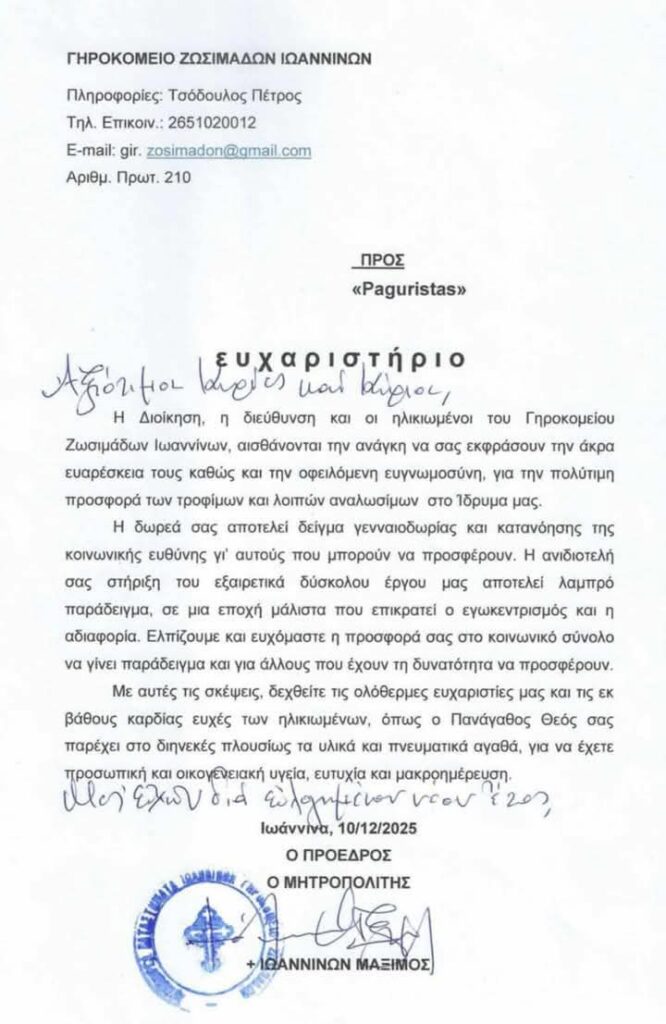 Μέλη της εθελοντικής ομάδας των Paguristas παρέδωσαν αγαθά, για να δώσουν χαρά και να καλύψουν σημαντικές ανάγκες των πιο ηλικιωμένων συμπολιτών μας που διαμένουν στα δύο γηροκομεία των Ιωαννίνων!